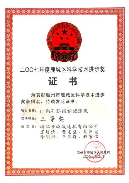 “CF系列斜齒輪減速機(jī)”科學(xué)技術(shù)進(jìn)步三等獎(jiǎng)證書