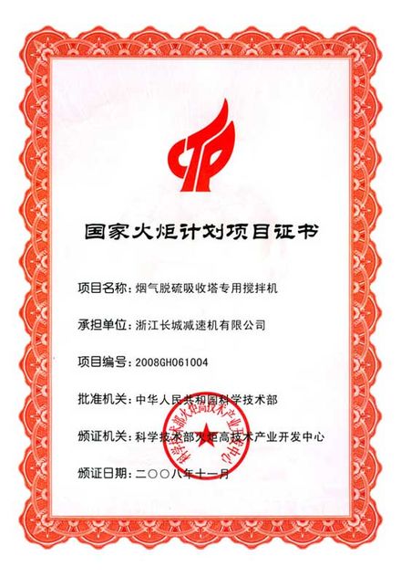 “煙氣脫硫吸收塔專用攪拌機(jī)”國(guó)家火炬計(jì)劃項(xiàng)目證書
