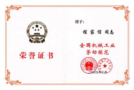 程家信“全國機械工業(yè)勞動模范”榮譽證書