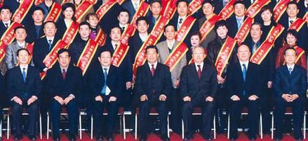 中共中央政治局常委、全國政協(xié)主席 賈慶林(下排中)、全國機械工業(yè)勞動模范 程家信(上排左二)