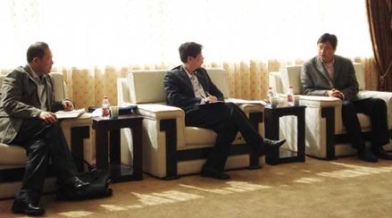 吳建明副區(qū)長(左二)及區(qū)發(fā)展局賈志文局長(左一)等區(qū)府領(lǐng)導(dǎo)詢問公司基本情況