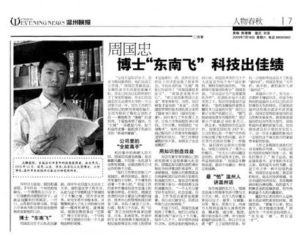 “父母不是知識分子,我讀書期間挺乖的,他們也沒怎么管我?!敝車倚χf道。安靜的讀書生活看似波瀾不驚,其實已經(jīng)為以后的科研打下了堅實的基礎。畢業(yè)后的周國忠在北京清華大學的一個公司里干過一年,因為工作的內(nèi)容和自己的研究領域有偏差,又因為結識了現(xiàn)在公司的老總——被他稱為“儒商”的虞培清,于是他來到了溫州,在“長城”一呆就是六年,如今和溫州老婆一起組成了名副其實的“新溫州家庭”。