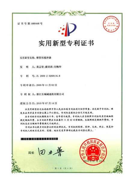 ZL 2009 2 0268116.8 錐管形攪拌器