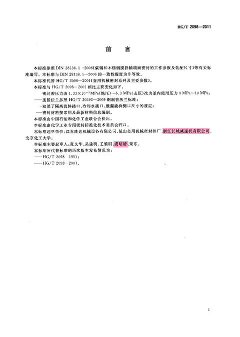 《釜用機(jī)械密封類型、主要尺寸及標(biāo)志》HG/T2098-2011封面及前言