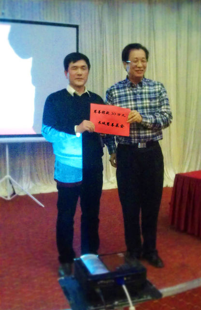 2013年1月4日我公司在溫州米蘭國際大酒店舉行迎春晚宴,在晚宴上公司董事長虞培清決定成立長城慈善基金會,下圖是虞董(右)現(xiàn)場給鹿城區(qū)慈善總會捐款30萬元。