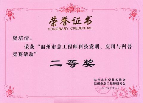 熱烈祝賀我司董事長虞培清榮獲2015年度“溫州市總工程師科技發(fā)明、應(yīng)用與科普競賽”活動(dòng)二等獎(jiǎng)
