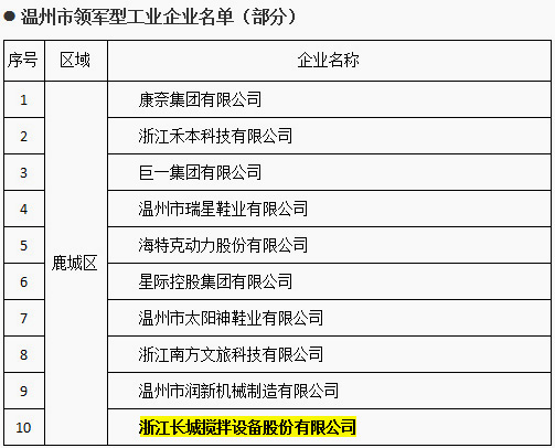 日前,溫州市政府公布了2020年溫州市領(lǐng)軍型工業(yè)企業(yè)、高成長型工業(yè)企業(yè)名單,長城攪拌入圍領(lǐng)軍型工業(yè)企業(yè)名單。