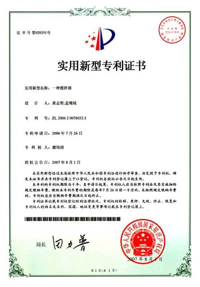 日前,“一種釜內(nèi)輔助支承裝置”和“一種攪拌器”正式獲得實用新型專利授權(quán)。這兩個專利均由我公司技術(shù)部經(jīng)理黃志堅高工和助理工程師孟繩續(xù)共同設(shè)計完成。其中的“一種釜內(nèi)輔助支承裝置”由于設(shè)有排料槽,從而減少了物料對滑動軸套或攪拌軸護套的磨損,有效地保證了它們的使用壽命。而“一種攪拌器”則與原有的螺帶式攪拌器相比,不僅具有其良好的攪拌效果,且更易于制造,降低了加工成本。