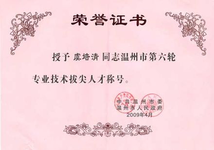 虞培清董事長(zhǎng)榮獲“溫州市第六輪專業(yè)技術(shù)拔尖人才”稱號(hào)