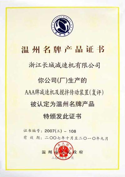 AAA牌減速機(jī)及攪拌傳動(dòng)裝置再次被認(rèn)定為溫州市名牌產(chǎn)品