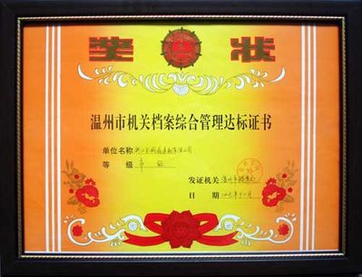 溫州市機(jī)關(guān)檔案綜合管理達(dá)標(biāo)證書