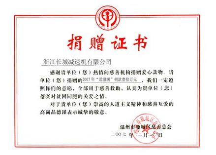日前,在2007年“送溫暖”慈善捐款活動(dòng)中,我公司虞培清總經(jīng)理代表公司向慈善機(jī)構(gòu)捐贈(zèng)“愛心款”拾萬元,以此表達(dá)對(duì)社會(huì)上貧困人群的一點(diǎn)關(guān)愛之情。溫州市鹿城區(qū)慈善總會(huì)為此頒發(fā)了“愛心...