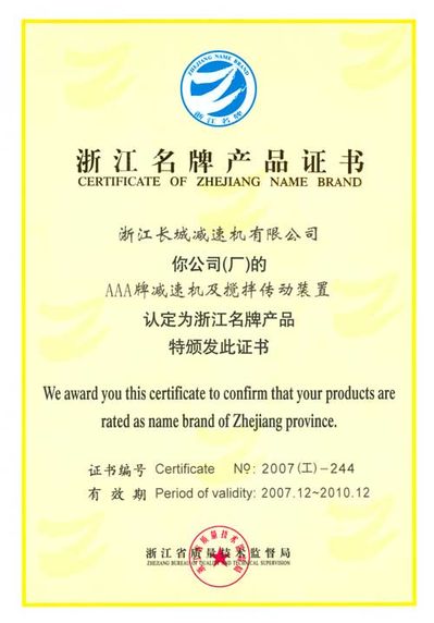 AAA牌減速機(jī)及攪拌傳動(dòng)裝置獲浙江名牌產(chǎn)品榮譽(yù)