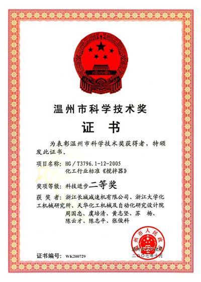 化工行業(yè)標(biāo)準(zhǔn)《攪拌器》 溫州市科技進(jìn)步二等獎(jiǎng)證書