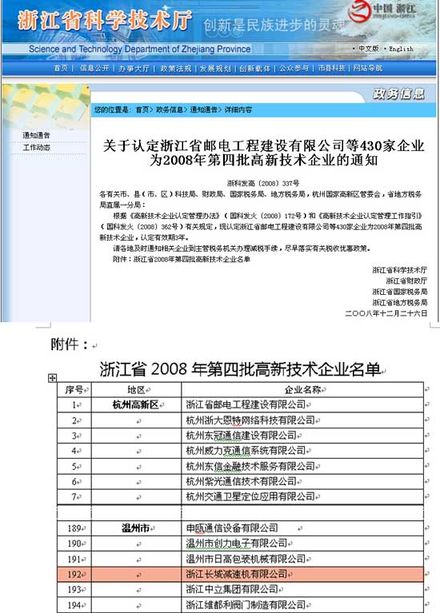 近日,公司正式通過“2008年第四批高新技術(shù)企業(yè)”認(rèn)定。此次重新評(píng)定的高新技術(shù)企業(yè)的認(rèn)定有效期為3年,將享受到以往所沒有的(10%)稅收優(yōu)惠政策。 浙江省科學(xué)技術(shù)廳網(wǎng)上公布...