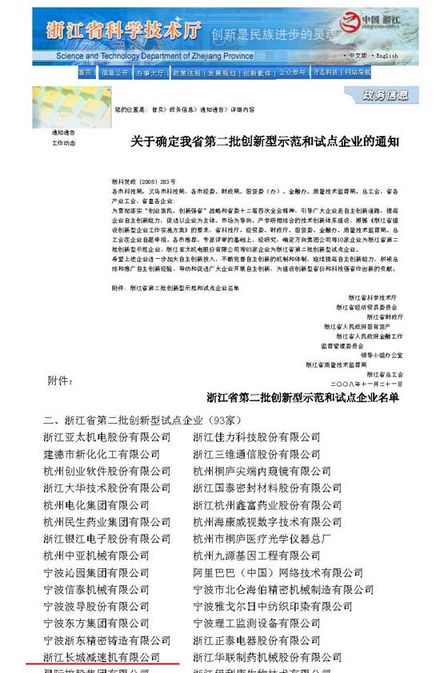 近日,我公司申報(bào)并獲得“浙江省創(chuàng)新型試點(diǎn)企業(yè)”的稱號(hào)。 浙江省科學(xué)技術(shù)廳網(wǎng)上公示       2008年12月8日《溫州晚報(bào)》第4版題為“我市9家企業(yè)入圍省級(jí)創(chuàng)...